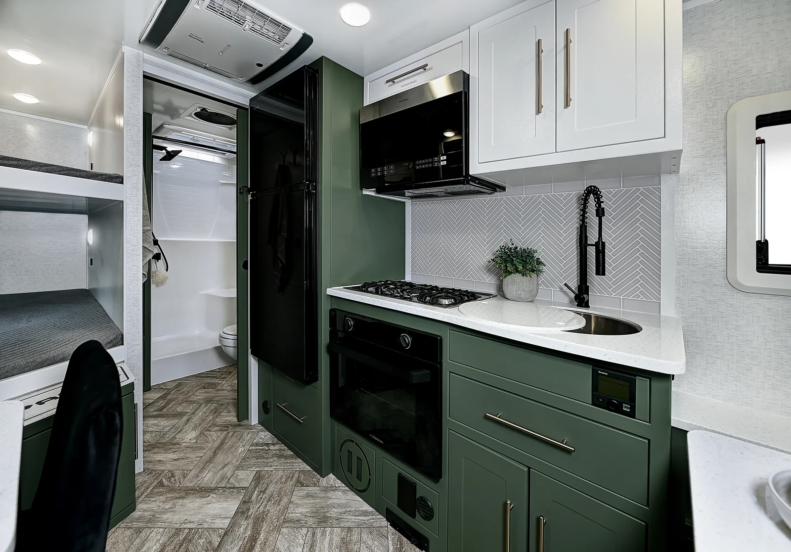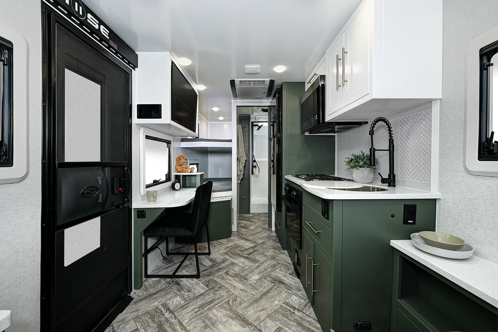 Bring the whole family along with this floorplan! A full size queen bed on the front of this trailer, along with two bunk beds in the rear grants comfortable sleeping for everyone. Make sure you get all your work done while on the road with an entertainment center and a desk below you can utilize for a work station. Cooking can be done with ease on the interior, or exterior of this floorplan. Exterior storage can be found in the rear garage and below the bottom bunk bed on the exterior.